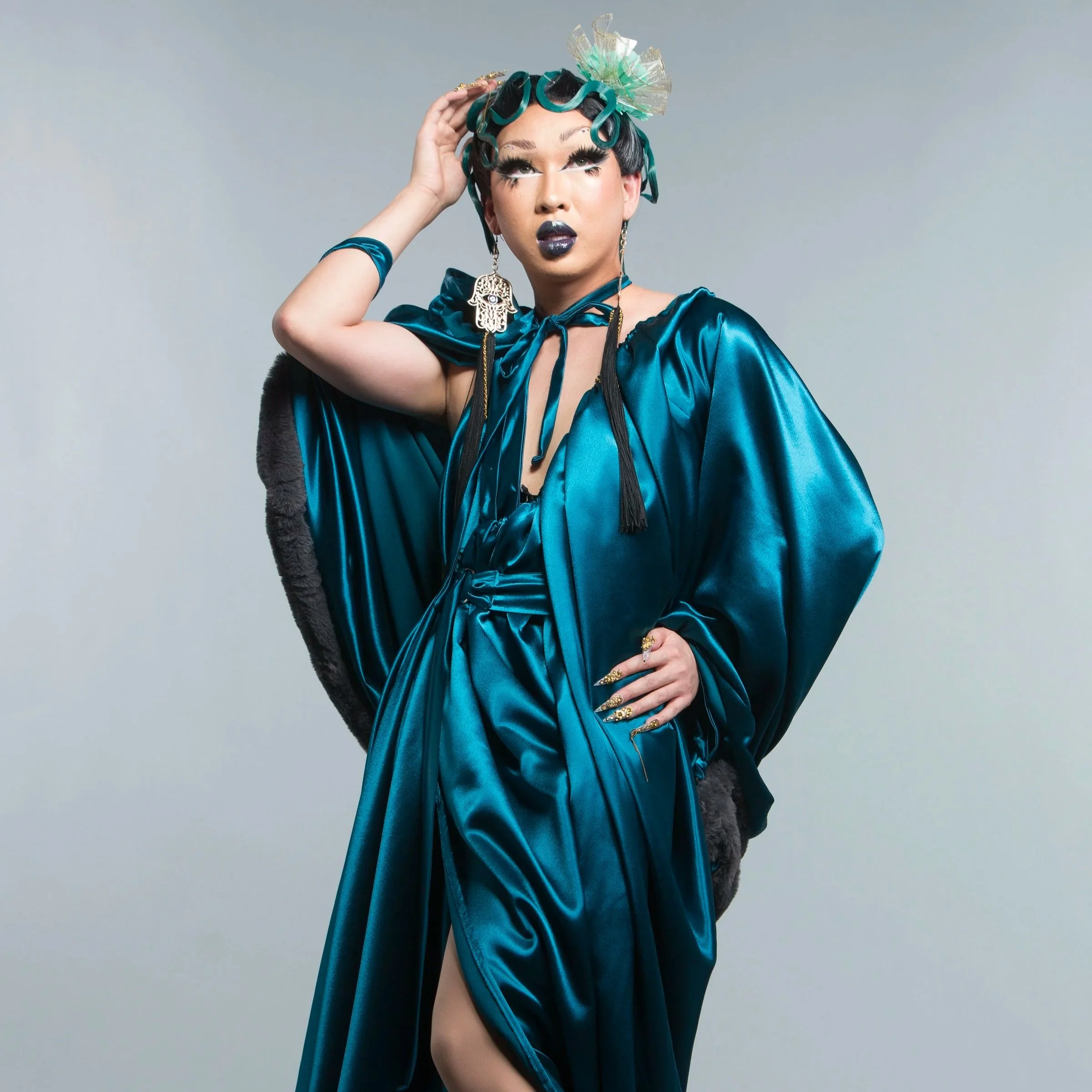 Fast forward to 2025: Suki was invited to compete on the Drag Race All Stars version in the Philippines, called #SlaysianRoyal and I was thrilled – I knew she would absolutely slay. In one episode, the Queens were given different coloured cacao leaves to use in their designs. Because Suki is the most skilled designer, she was given a disadvantage of not being able to choose her colour. Instead, she had to work with the colour that was left over. Turns out, it was teal. In Suki’s case, this was certainly not a disadvantage.